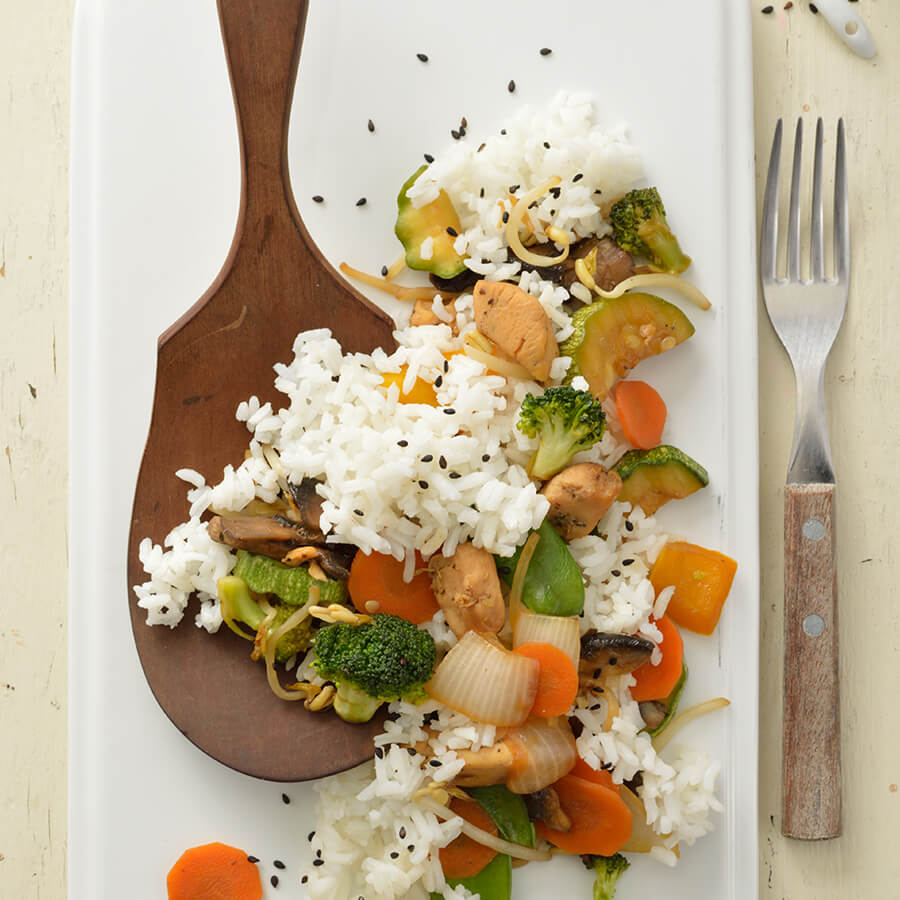 - Enjuague el arroz hasta que el agua esté transparente, coloquelo en una olla con con agua a fuego alto durante 15 min, cocine con tapa y reserve.